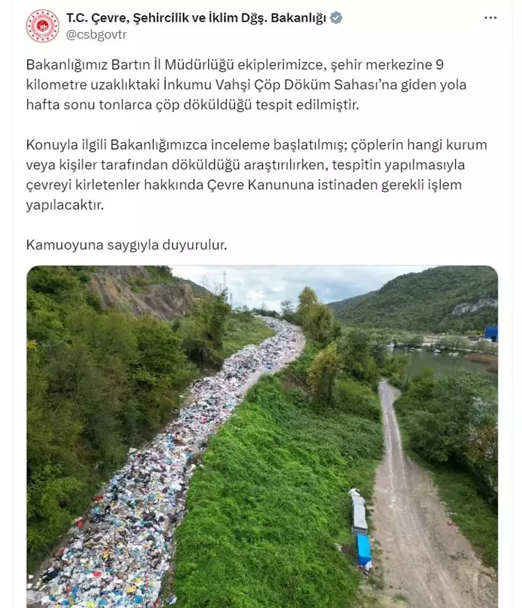 Çevre, Şehircilik ve İklim Değişikliği Bakanlığı’nın sosyal medya hesabından olaya ilişkin açıklama yapıldı. Açıklamada “Bakanlığımız Bartın İl Müdürlüğü ekiplerimizce, şehir merkezine 9 kilometre uzaklıktaki İnkumu Vahşi Çöp Döküm Sahası’na giden yola hafta sonu tonlarca çöp döküldüğü tespit edilmiştir. Konuyla ilgili Bakanlığımızca inceleme başlatılmış; çöplerin hangi kurum veya kişiler tarafından döküldüğü araştırılırken, tespitin yapılmasıyla çevreyi kirletenler hakkında Çevre Kanununa istinaden gerekli işlem yapılacaktır” dendi.