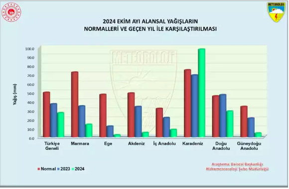 Akdeniz: Ekim ayı yağışı normali 48,7 kg ve 2023 yılı ekim ayı yağışı 33,7 kg iken bu yıl ekim ayında 4,8 kg’a düştü. Yağışlar normaline göre yüzde 90, 2023 yılı ekim ayı yağışlarına göre yüzde 86 azaldı.