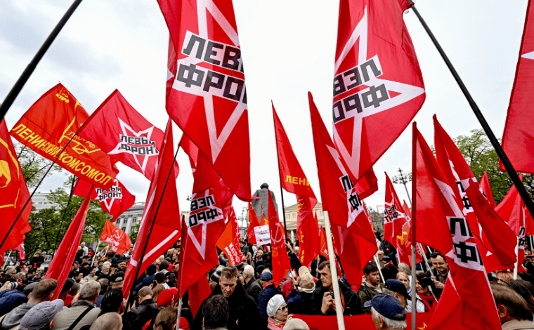 Rusya’nın başkenti Moskova’da, 1 Mayıs dolayısıyla Rusya Komünist Partisi (KPRF) tarafından Tiyatro Meydanı’nda miting düzenlendi. Fotoğraf: AA