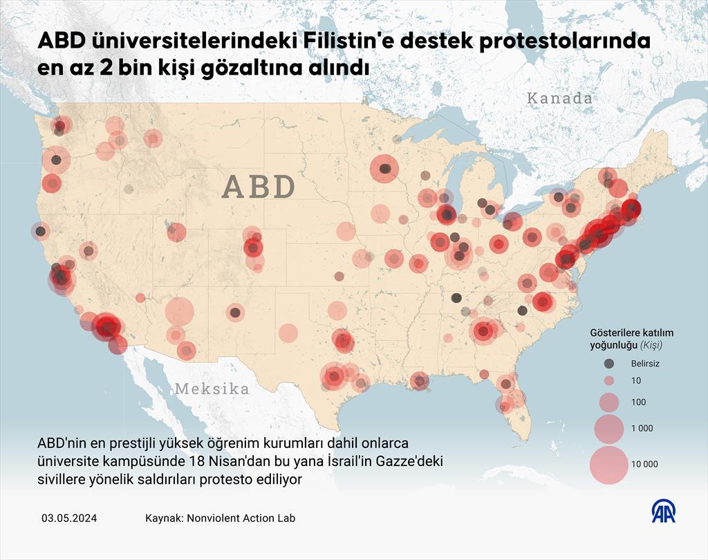 ABD’nin en prestijli yüksek öğrenim kurumları dahil onlarca üniversite kampüsünde 18 Nisan’dan bu yana İsrail’in Gazze’deki sivillere yönelik saldırıları protesto ediliyor. Grafik: AA