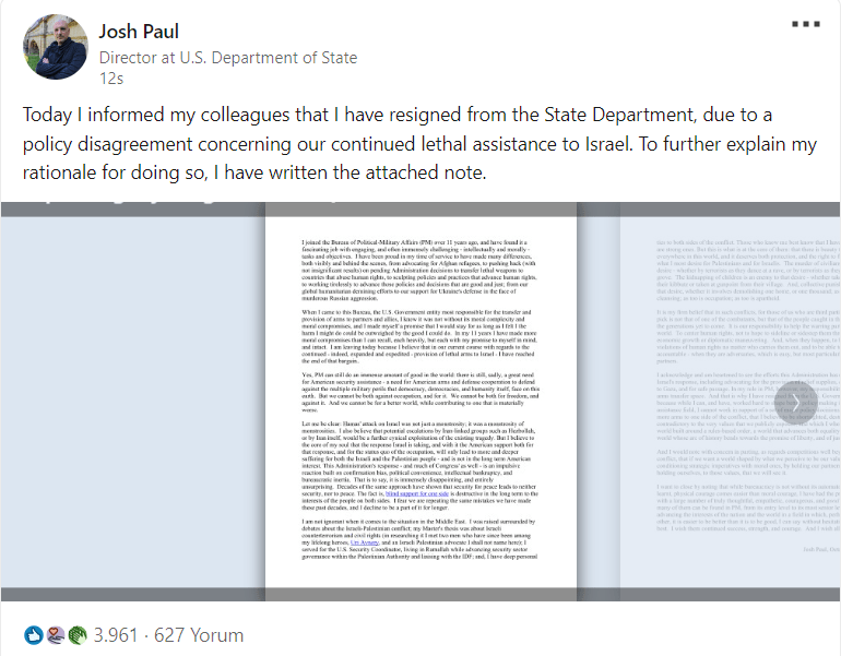 Josh Paul Amerika Birleşik Devletleri (ABD) Dışişleri Bakanlığında ve başka departmanlarda 11 yıldır görev yapan deneyimli siyasetçi Josh Paul, ülkesinin İsrail’e desteği nedeniyle istifa ettiğini duyurdu.
