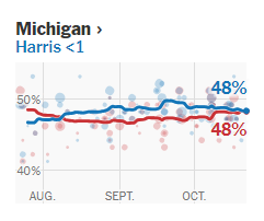🔹Anketler neyi gösteriyor: Detroit News’in 1-4 Ekim tarihleri arasında yaptığı ankete göre Harris eyalette çok küçük bir farkla önde. Washington Post’un anketi de Detroit News’inkinden farklı değil. New York Times’ın birçok anketin ortalamasını çıkardığı verilere göreyse her iki aday da yüzde 48’de kalmış durumda.