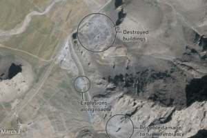Geçen ay çekilen uydu fotoğraflarında görülebilen, İran’ın Tebriz şehrinin kuzeyindeki bir yeraltı füze üssünün tünel girişi, 1 Mart tarihli bir fotoğrafta çökmüş haldeydi; bu da tesisin hava saldırılarında hedef alındığının bir işaretiydi. Martin Center tarafından yayınlanan bir Planet görüntüsüne göre, Tebriz yakınlarındaki başka bir bölgedeki tünel girişleri de hasar görmüştü.