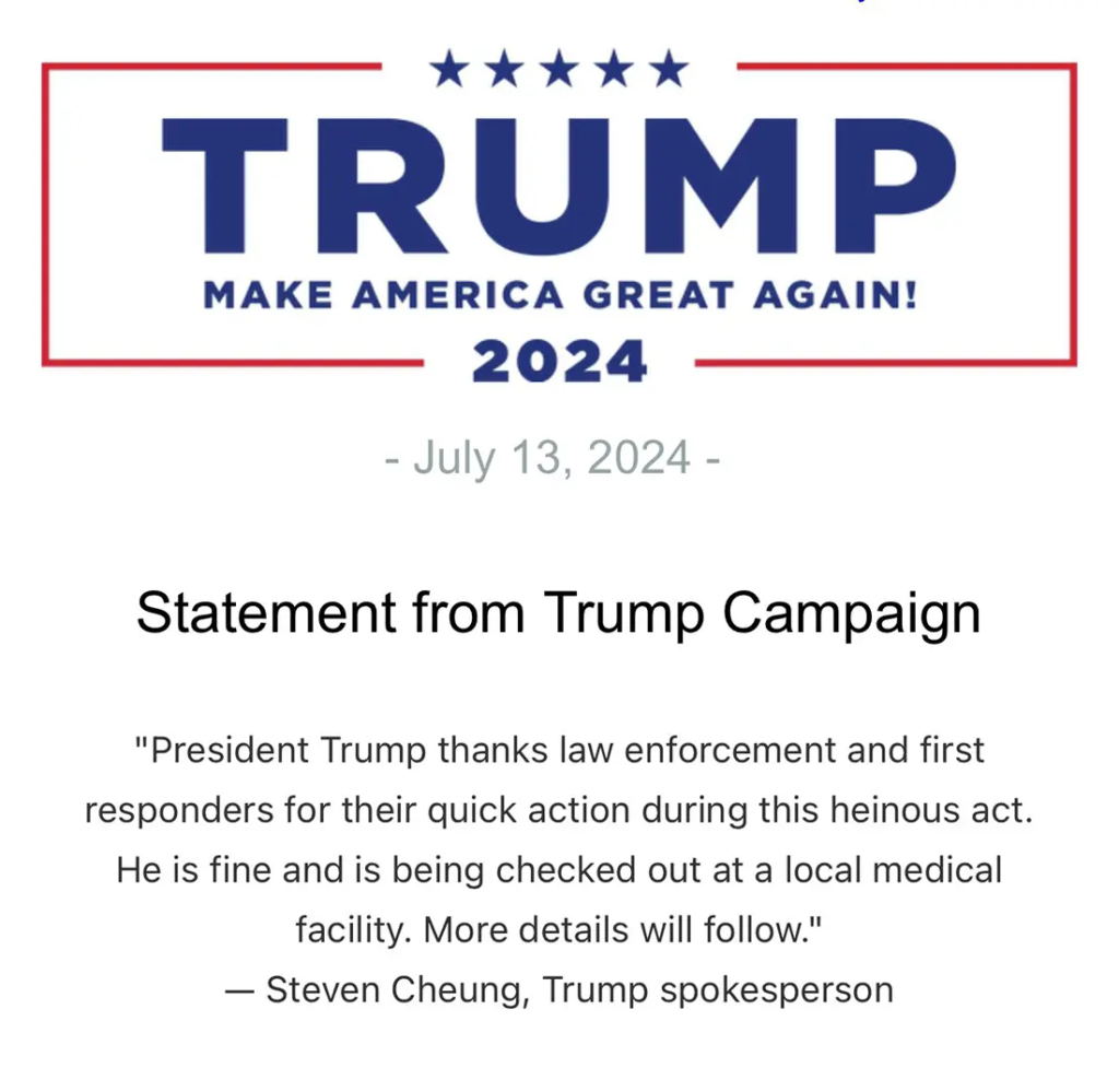 Trump’ın sözcüsü Steven Cheung saldırıdan 40 dakika sonra eski başkanın “iyi olduğunu” ve bir sağlık merkezinde muayene edildiğini söylüyor.