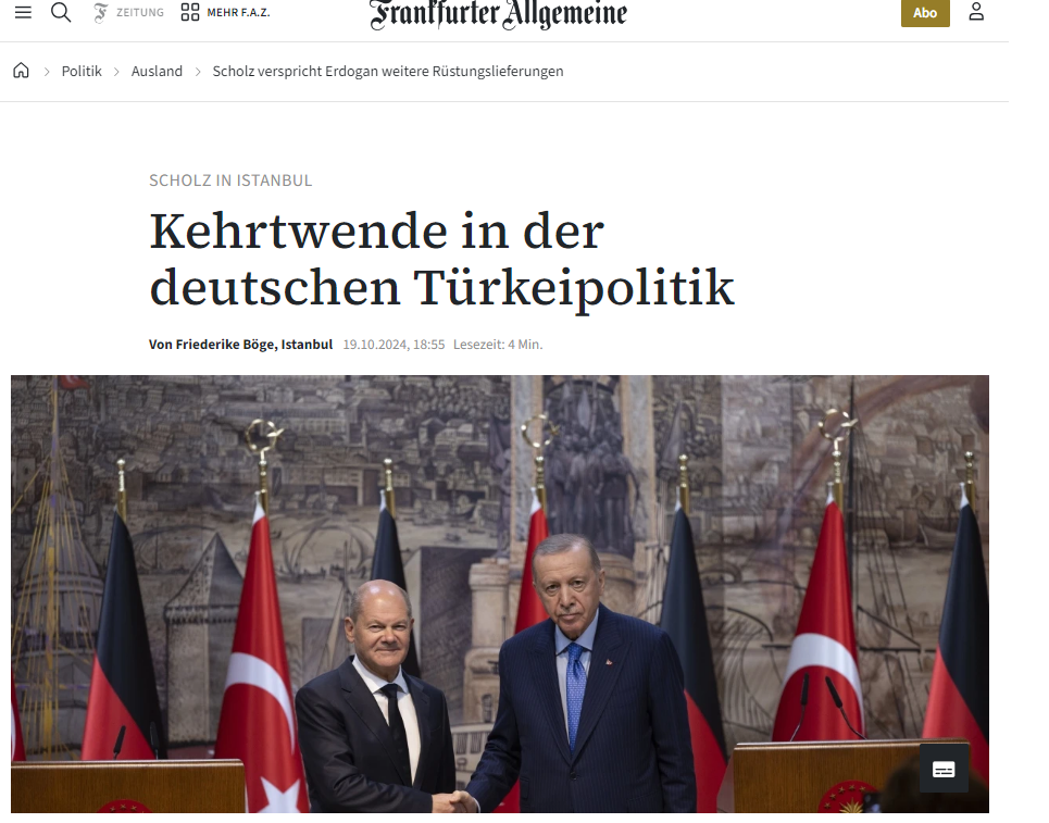 Frankfurter Allgemeine Zeitung (FAZ) bu ziyareti “Almanya’nın Türkiye politikasındaki U dönüşü” başlığıyla verdi. Friederike Böge kaleme aldığı yazıda izlenimlerini “Türkiye’ye silah ihracatı Alman hükümetinin uzun zamandır tabu olarak gördüğü bir konu. Oysa Scholz cumartesi günü Erdoğan ile basının karşısına çıktığında sanki hiç bu endişeler duyulmamış gibi davrandı” sözleriyle aktardı.