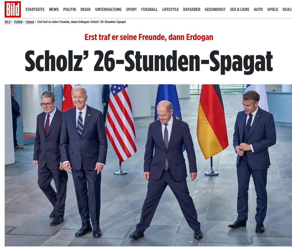 İmzasız yazıda spotta “Olaf Scholz cuma günü en iyi dostlarıyla buluştu, bir gün sonra da en zorlu NATO ortağıyla boğuşmak zorunda kaldı” dendi. Scholz’un “en iyi dostları” olarak gösterilen kişiler, Berlin’e veda ziyaretine gelen ABD Başkanı Joe Biden, Fransa Cumhurbaşkanı Emmanuel Macron ve İngiltere Başbakanı Keir Starmer’dı. Bild “Dört liderin keyfi yerindeydi, başbakanlık binasında fotoğraf çektirerek ne kadar yakın olduklarını gösterdiler. Verdikleri mesaj ‘Batı ittifakı olarak birlikte dimdik duruyoruz’du” diye yazdı.