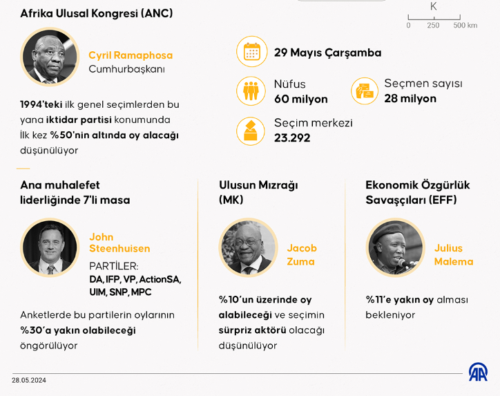 Bir zamanlar sendika lideriyken kendini milyoner bir iş insanı olarak bulan Cyril Ramaphosa bu seçimde seçmenleri etkileyebilecek bir muhalefetle karşı karşıya. Bu partiler arasında iş insanları yanlısı Demokratik İttifak (DA), ANC’nin gençlik kollarının eski liderlerinden biri tarafından kurulan solcu Ekonomik Özgürlük Savaşçıları (EFF) ve uMkhonto weSizwe (MK) var. (ANC’nin Mandela tarafından kurulan silahlı kanadından ayrı.)