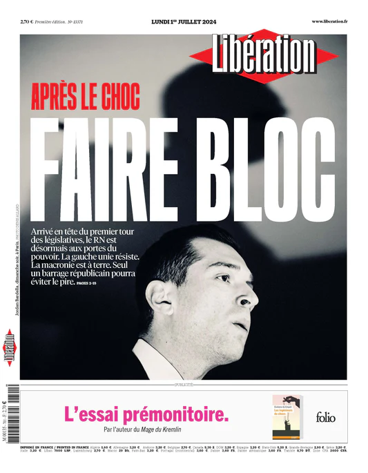 Libération gazetesi ise Jordan Bardella ve partisi RN’nin ilk turu önde bitirmesi üzerine “Şaşkınlığın ardından cephe kurmak” manşetini kapağına taşıdı. Kapak haberinde “Parlamento seçimlerinin ilk turundan zaferle çıkan RN artık iktidarın eşiğinde. Sol ittifak direniyor. Macron yerde. Sadece cumhuriyetçi bir yaylım ateşi en kötünün yaşanmasını engelleyebilir” dendi.