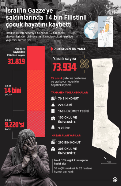 Savaşta şimdiye kadar 31 binden fazla insan öldürüldü. Son beş ayda Gazze’de öldürülen çocuk sayısı, son dört yılda dünya genelinde yaşanan çatışmalarda öldürülen çocuk sayısından daha fazla.
