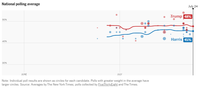 Ancak bu anket Harris’in tamamen önde olduğu anlamına gelmiyor. New York Times’ın son dönemde ulusal çaptaki anketlerin ortalamasını aldığı grafik ise Trump’ın yüzde 48’e yüzde 45 Harris’in önünde olduğunu gösteriyor.