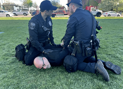 Wisconsin-Madison Üniversitesi’nin gazetesi The Daily Cardinal’den Tyler Katzenberger’in çektiği fotoğrafta toplum ve çevre sosyolojisi doçenti Samer Alatout polis memurları tarafından yere yatırılmış tutuklanırken görülüyor.Alatout daha sonra WMTV’ye verdiği demeçte kampüsteki Filistin yanlısı protestoları durdurmak için çevik kuvvetin geldiğini söyledi .Son iki gündür düzenlenen ve farklı dini ve etnik kökenlerden öğrencilerin bir araya geldiği protestoların “güzel ve barışçıl” olduğunu söyledi. Alatout protestolara öğretmenlerin de destek verdiğini söyledi.