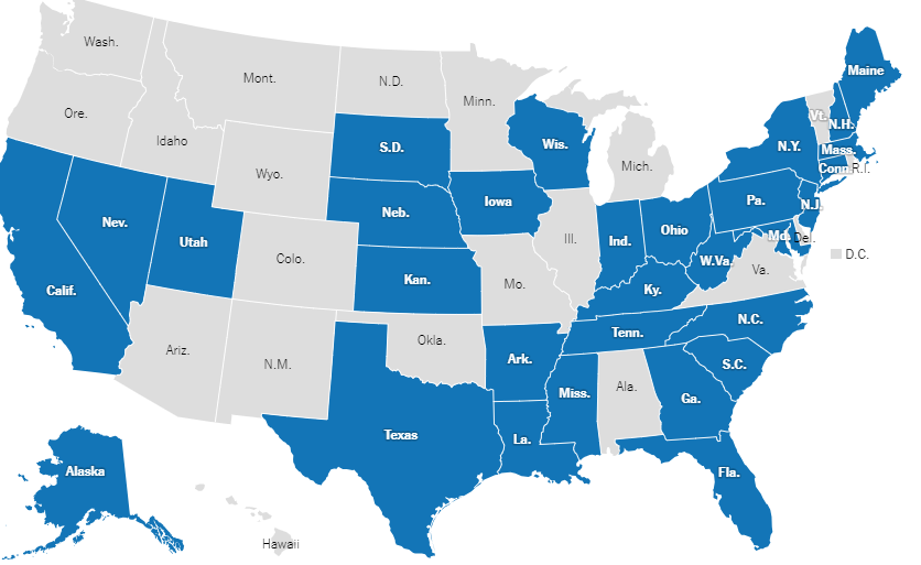 Maviyle gösterilen yerler Harris’e desteğini açıklayan delegeler. Fotoğraf: New York Times