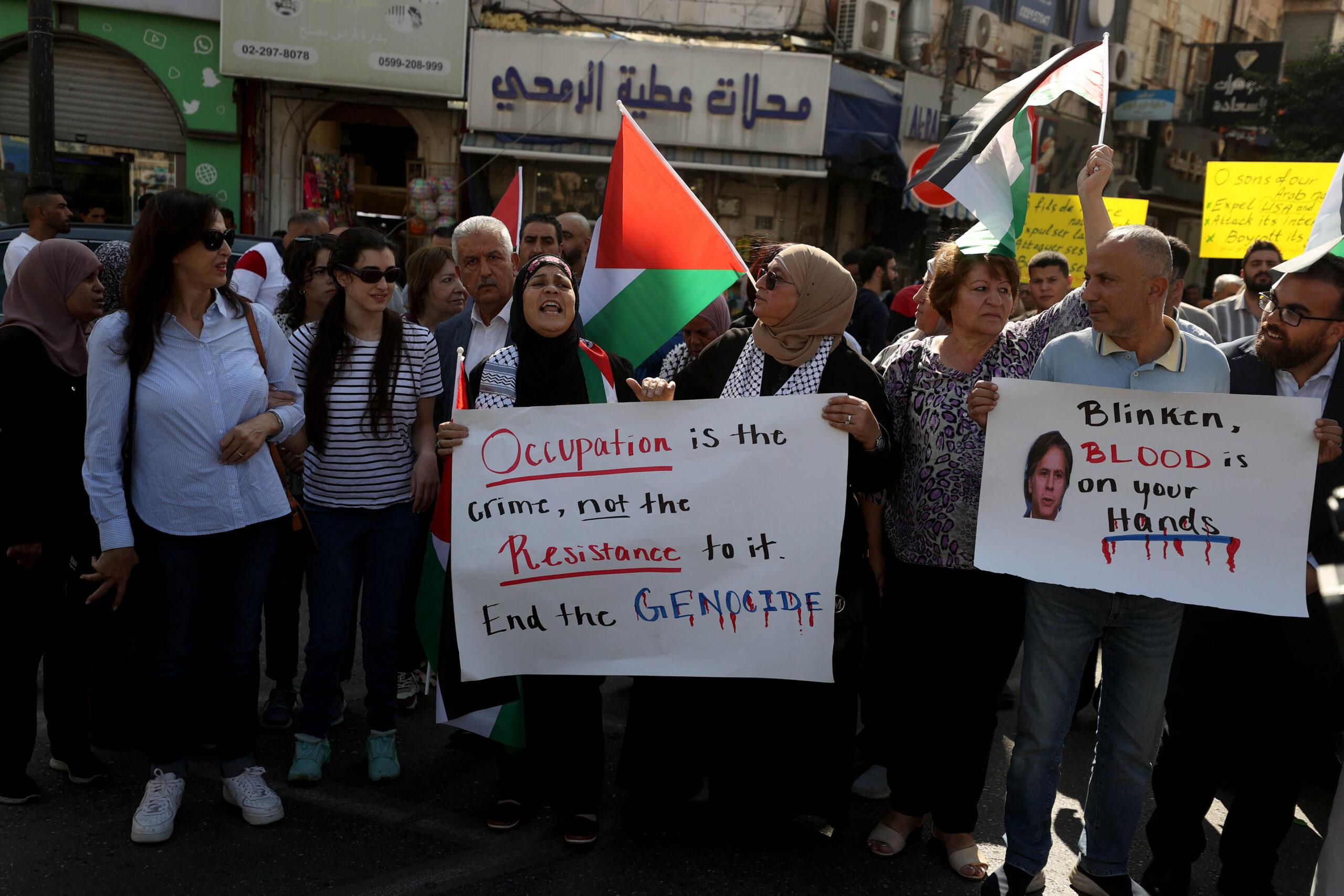 Ramallah’ta düzenlenen protestoda Filistinlilerin taşıdığı pankartlardan birinde, “Suç olan işgaldir, işgale direniş değil. SOYKIRIMA son verin”, diğerinde ise “Blinken ellerinde kan var” yazıyor. Fotoğraf: AA