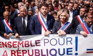 L’Haÿ-les-Roses belediye başkanı Vincent Jeanbrun (ortada), Fransız Senatosu Başkanı Gérard Larcher (soldan ikinci) ve Île-de-France Bölge Konseyi Başkanı Valérie Pécresse, Jeanbrun’un evine yapılan saldırının ardından düzenlenen mitingde. Fotoğraf: Yoan Valat/EPA