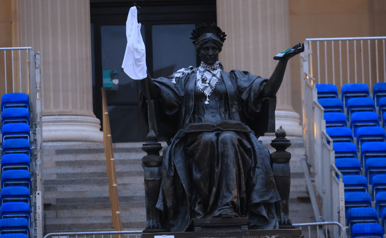 Öğrencilerin açtığı diğer pankartın üzerindeyse “Hind Hall” yazıyordu. Hind Rajab İsrail ateşi altında hayatını kaybeden altı yaşında Filistinli bir kız çocuğuydu. Öğrenciler Hamilton Hall’un adının artık “Hind Hall” olduğunu söylediler.