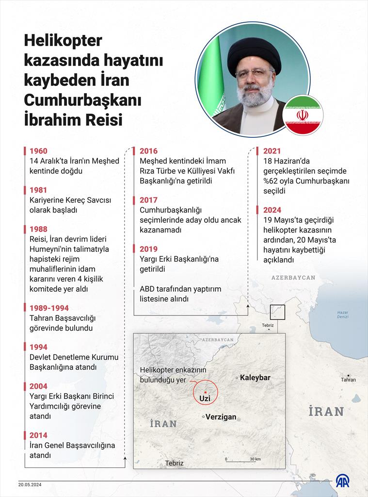 Suikast mı yoksa kaza mı soruları cevapsız kalmaya devam ederken İran Genelkurmay Başkanlığı, Cumhurbaşkanı İbrahim Reisi’nin bulunduğu helikopterin kaza yapmasına ilişkin ön raporu yayımladı. Ön raporda, kaza yapan helikopterin parçalarında kurşun veya benzeri harici cisim izine rastlanmadığı, düşüş sonrasında helikopterde yangın çıktığı, bölgenin engebeli, havanın soğuk ve sisli olmasının arama kurtarma çalışmalarının uzamasına neden olduğu belirtildi.