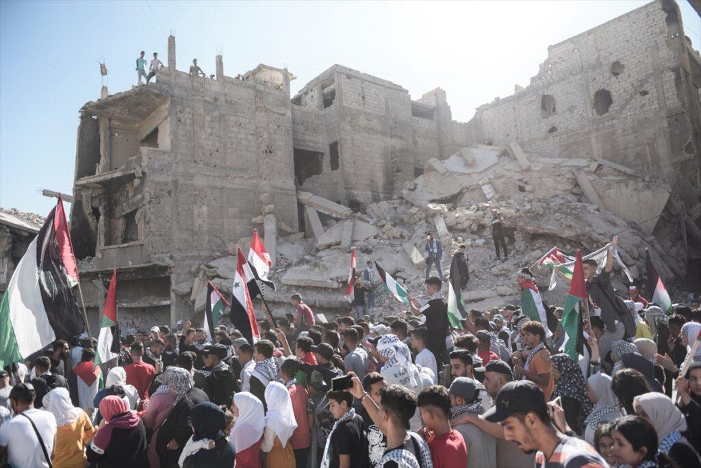 Suriye’nin başkenti Şam’da yüzlerce kişi ellerinde ‘Filistin’e özgürlük’ yazan pankartlar ve Filistin bayraklarıyla sokakları doldurdu.