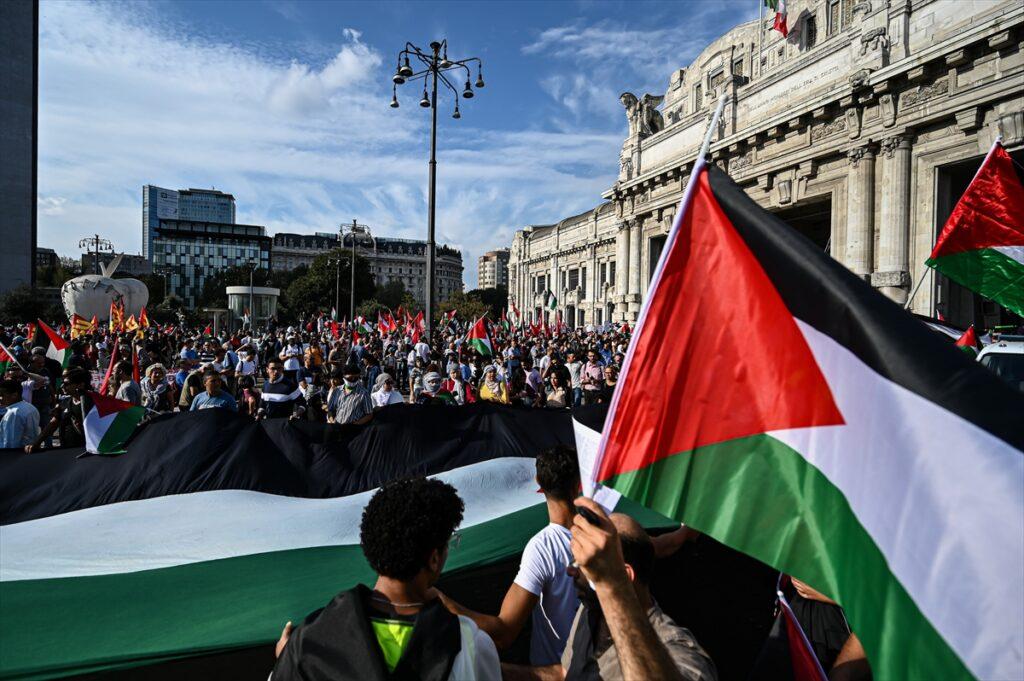 “Filistin ile dayanışma” yürüyüşüne, Filistinliler ve İtalyanların yanı sıra farklı ülkelerin vatandaşları, öğrenci grupları ile çeşitli sol gruplar katıldı.