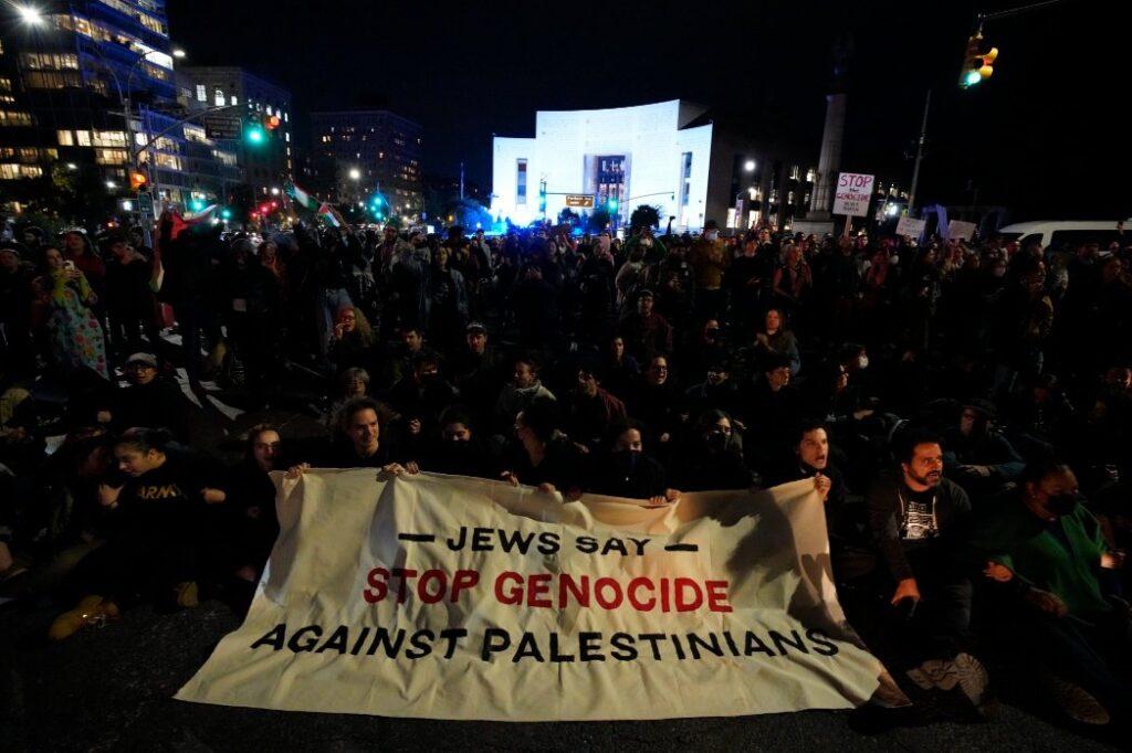 New York’ta eylem yapan Yahudiler. Pankartta, “Filistinliler yönelik soykırımı durdurun” yazıyor. Kaynak: X