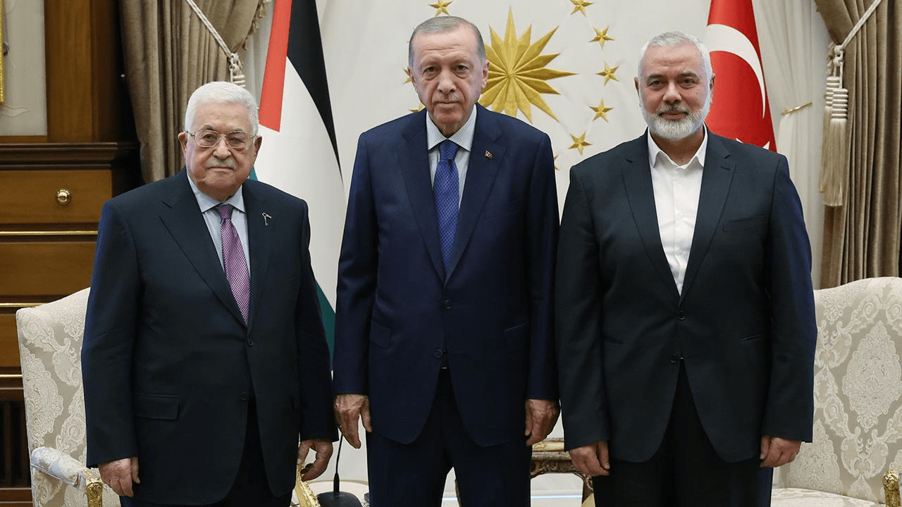 Soldan sağa Mahmud Abbas, Tayyip Erdoğan ve İsmail Haniye.