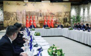 “İsrail’in soykırım uyguladığı Filistin halkına yaptığınız yardımlar dolayısıyla tebrik ediyorum. Türkiye, Gazze’ye gönderdiği 50 bin tona yaklaşan insani yardım malzemesiyle dünyada ilk sıradadır. İsrail’i ateşkese zorlamak amacıyla ticari olarak biliyorsunuz bazı tedbirler aldık. Adımın sonuçlarını iş dünyası ile eşgüdümle yürüteceğiz.
