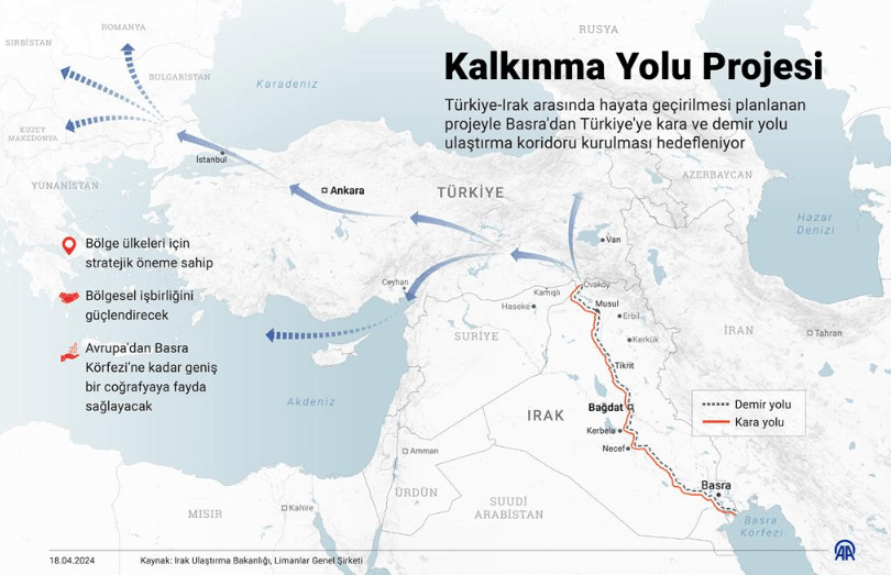 Bu görüşmeyi Sudani ile olan ve daha kritik görüşme izledi. Sudani ile hem baş başa hem de heyetler arası görüşmelerin ardından görüşmeden önce gündeme gelen 20 milyar dolarlık Kalkınma Yolu Projesi için anlaşma imzalandı. Anlaşmada sadece Irak ve Türkiye’nin değil, projeye finansman sağlayacak Katar ve Birleşik Arap Emirlikleri’nin de (BAE) imzası var. Kalkınma Yolu Projesi Körfez üstünden deniz yoluyla Basra’ya, oradan da karayolu ve demiryollarıyla Türkiye’ye ve Avrupa’ya uzanan, Irak ve Türkiye’yi birbirine bağlayacak küresel anlamda önemli bir proje.