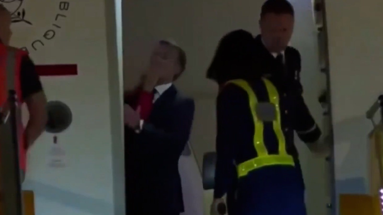 Associated Press tarafından kaydedilen görüntüde uçağın kapısı açıldığında Emmanuel Macron beliriyor.