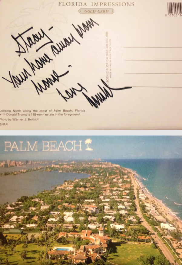 Trump ilerleyen günlerde Willaims’ın menajerine Palm Beach’teki evinin havadan görüntüsünü içeren bir kartpostal göndermiş. Willims’ın İngiliz gazetesi The Guardian ile paylaştığı kartpostalda “Stacey – Kendini evinde hissedeceğin evler. Sevgiler Donald” yazıyor.