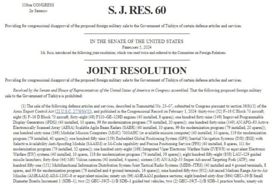 Türkiye F-16 satışının resmen onaylanması için 15 günlük sürenin sona ermesini beklerken Cumhuriyetçi Senatör Rand Paul satışa itiraz eden bir yasa tasarısı hazırladı. Diplomatik kaynaklar süreçte herhangi bir aksama olmadığını belirtiyor.