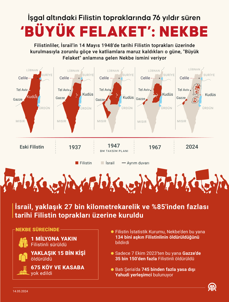 Fotoğraf: AA Filistinliler İsrail’in 14 Mayıs 1948’de işgal altında tuttuğu Filistin topraklarında bağımsızlık ilan ettiği ve Filistinlileri zorunlu göçe tabi tuttuğu Nakba’nın (Büyük Felaket) 76’ncı yılında yine İsrail’den gelen bir felaketle boğuşuyor. Nakba anmaları İsrail’in saldırıları altında yapıldı. İsrail ordusu Nakba’nın yıl dönümünde düzenlenen gösterilere de müdahale etti, bir Filistinli öldü. Öte yandan İsrail hükümeti Birleşmiş Milletler Genel Kurulu’nun Filistin kararını da reddettiğini açıkladı. Cumhurbaşkanı Tayyip Erdoğan ise dünkü konuşmasında İsrail’in işgalinin Gazze ile sınırlı olmadığını, Anadolu’nun da planları dahilinde olduğunu söyledi.