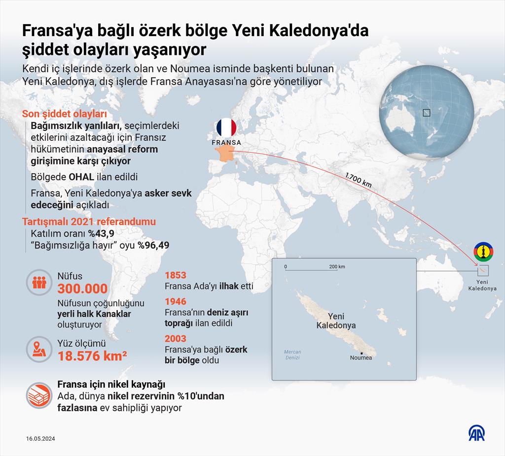 Yeni Kaledonya’da bağımsızlık yanlıları seçimlerdeki etkilerini azaltacağı için Fransız hükümetinin anayasal reform girişimine karşı çıkıyor. Adada son iki gündür artan şiddet olaylarında yaklaşık 200 iş yeri ve 50’den fazla araç ateşe verilmişti. Olaylarda 130 kişi gözaltına alındı ve 60’tan fazla güvenlik görevlisi yaralandı. Yeni Kaledonya’da artan şiddet olaylarının ardından Fransa çarşamba günü Yeni Kaledonya’da olağanüstü hal ilan etti ve TikTok’u da yasakladı.