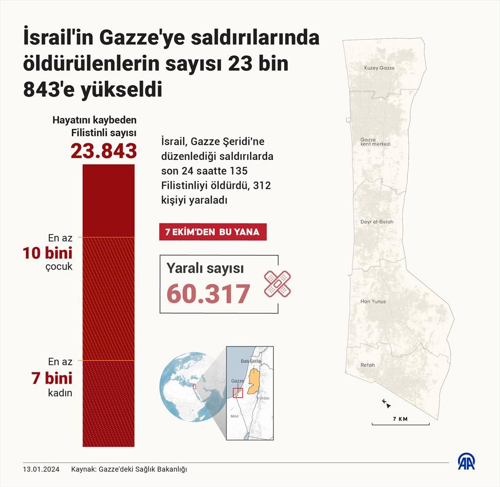 Gazze’deki Sağlık Bakanlığı Sözcüsü Eşref El-Kudra İsrail saldırılarında son 24 saat içinde 135 Filistinlinin öldürüldüğünü ve 312 kişinin yaralandığını söyledi. 7 Ekim’den bu yana çoğu sivil olmak üzere toplam 23 bin 843 Filistinli hayatını kaybetti. İsrail ise Filistinli örgütlerden şu ana kadar en az 8 bin savaşçıyı öldürdüğünü açıkladı.