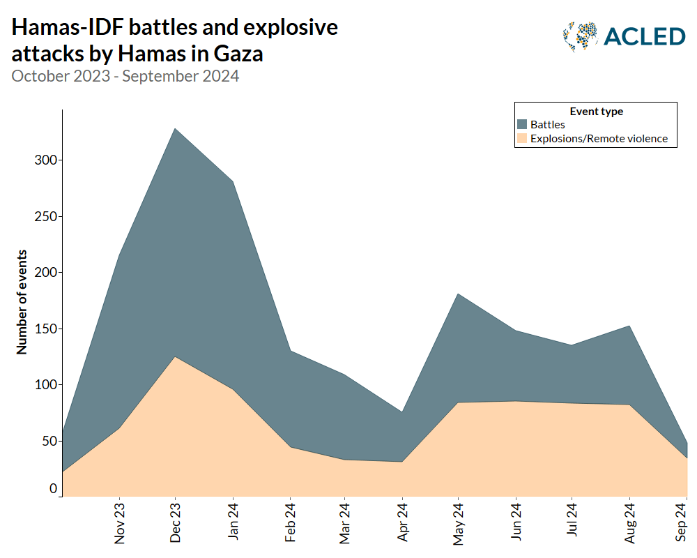 Ekim 2023-Eylül 2024 tarihleri arasında Hamas ve İsrail askerleri arasındaki çatışmalar ve Hamas’ın uzaktan saldırıları. Koyu renkle gösterilen oranlar çatışmaları, açık renkli gösterilen yerler de patlamaları ve uzaktan saldırıları gösteriyor. Grafik: ACLED
