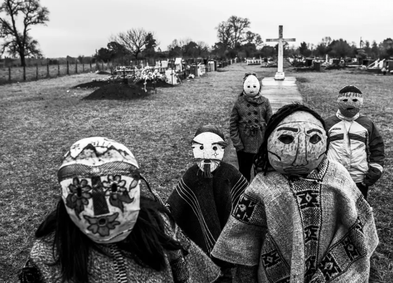 Bu kez görüntü Şili’deki Los Rios’tan Temmuz 2019’a ait. Gördüğünüz kişiler de Mapuche mezarlığında Ngillatun maskeri takan çocuklar. Mapuche topluluğu o zaman tören alanlarını sular altında bırakacak hidroelektrik barajının inşasına karşı çıkmış ve direnişleri başarıyla sonuçlanmıştı. Fotoğrafın açıklamasında, “Mapucheler şu anda Arjantin ve Şili’nin parçası olan topraklarda yaşayan yerlilerdir. Atalarından kalan toprakları Şili’de madencilik, ormancılık ve hidroelektrik projeleri için, Arjantin’deyse hidrolik kırma projeleri için sömürülüyor” deniyor.