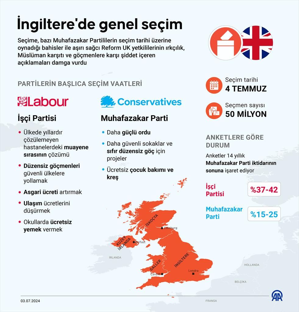 Sunak “Şimdi İngiltere için geleceğini seçme zamanıdır. Kaydettiğimiz ilerlemenin üzerine inşa etmek mi yoksa plansız ve kesinlikten yoksun bir şekilde başa dönmek mi istediğimize karar verme zamanı. Bugün erken saatlerde İngiltere Kralı ile görüşerek parlamentonun feshedilmesini talep ettim. Kral talebi kabul etti ve 4 Temmuz’da genel seçimlere gideceğiz” demişti.