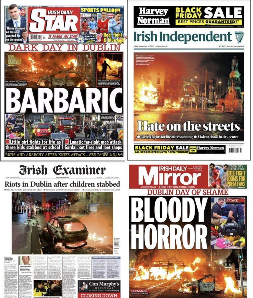 Kadın ve bir çocuğun durumunun ağır olduğu, 40’lı yaşlardaki ağır yaralı bir erkeğin de şüpheli olarak gözaltına alındığı açıklanmıştı. Polis zanlının milliyetiyle ilgili bilgi paylaşmasa da, “Cezayir asıllı” olduğu iddialarının medyada yayılmasının ardından aşırı sağcılar sokaklara indi, göçmen karşıtlığının yarattığı büyük öfkeyle sokakları savaş alanına çevirdi. Arabaların ateşe verildiği, sokak çatışmaları yaşanan gecede 34 kişi gözaltına alındı. İrlandalı yetkililer olayları başlatanlar için “aşırı sağ ideolojiyle hareket eden delirmiş bir grup holigan” tanımlaması yaptı.