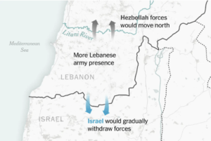 The New York Times’ın yayınladığı haritaya göre Hizbullah güçlerini kuzeye, İsrail sınırından uzağa çekecek, onların çekildiği bölgeye Lübnan ordusu girecek.