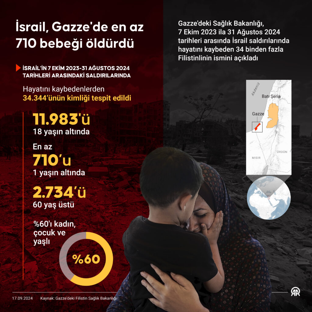 Gazze’deki Sağlık Bakanlığı, 7 Ekim 2023 ila 31 Ağustos 2024 tarihleri arasında İsrail saldırılarında hayatını kaybeden 34 binden fazla Filistinlinin ismini açıkladı. ( Murat Usubali – Anadolu Ajansı )