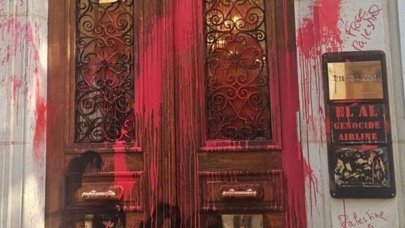 Şirketin Paris’teki ofisinin kapısına kırmızı sprey boyayla “El Al Soykırım Hava Yolları” ve “Filistin kazanacak” ifadeleri yazılırken, kapıya kanı sembolize eden çizimlerin de yapılması dikkati çekti.