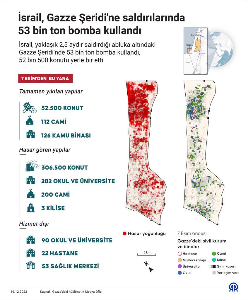 Gazze’deki yönetime bağlı medya ofisinden yapılan yazılı açıklamada, İsrail’in 7 Ekim’den bu yana düzenlediği saldırılarda Gazze’de yaşanan yıkım anlatıldı. Gazze Şeridi’ndeki Filistin halkına yönelik kapsamlı bir soykırım gerçekleştirildiği belirtilen açıklamada, İsrail ve ABD güçlerinin Gazze Şeridi’nin her metrekaresini bombaladığı ifade edildi. Gazze’deki yönetim tarafından açıklanan verilere göre, İsrail saldırılarında, 53 bin ton bomba kullanıldı, bombardımanlarda da Gazze Şeridi’nin genelinde 52 bin 500 konut tamamen yıkıldı.