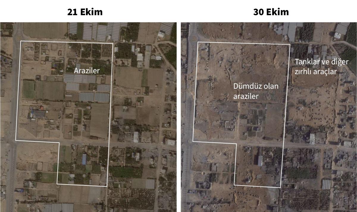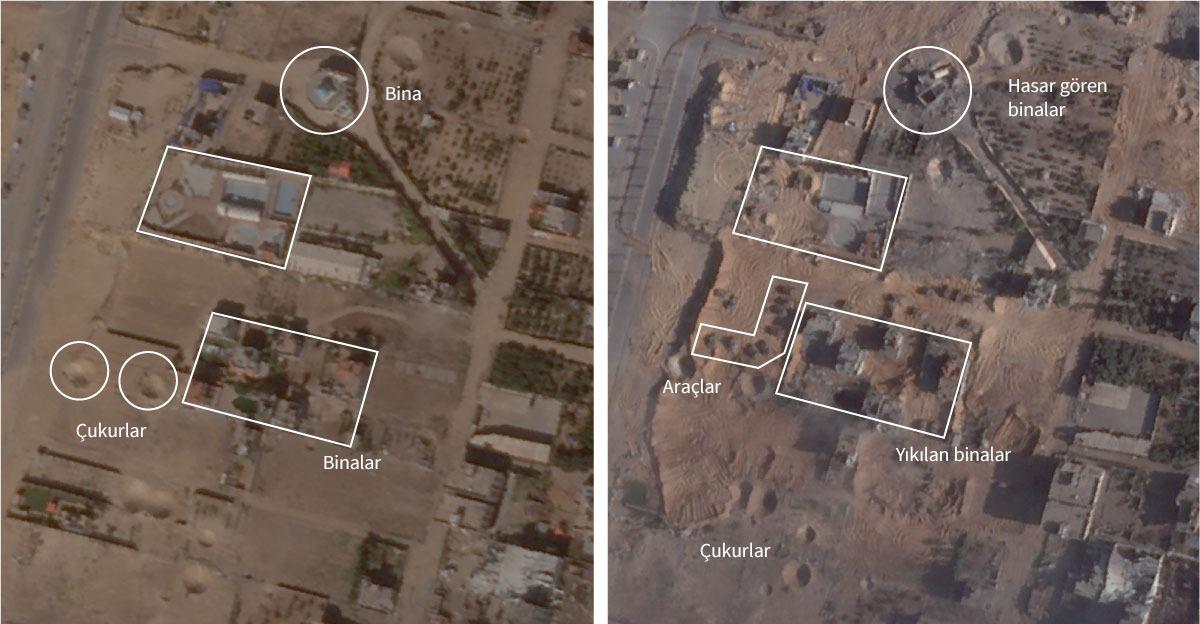 Civardaki birçok bina hava saldırılarında ağır hasar almış ya da tamamen yıkılmış. Hava saldırısı ve bombardımanlar yüzlerce çukur oluşturmuş ve apartmanlar dümdüz olmuş. Planet Labs’in aşağıya ekleyeceğimiz uydu görüntüleri İsrail tanklarının Gazze’nin en büyük şehri Gazze’nin kuzeyinde, kentleşmenin en yoğun olduğu bölgeye ilerlediği üç istikametten birini gösteriyor.