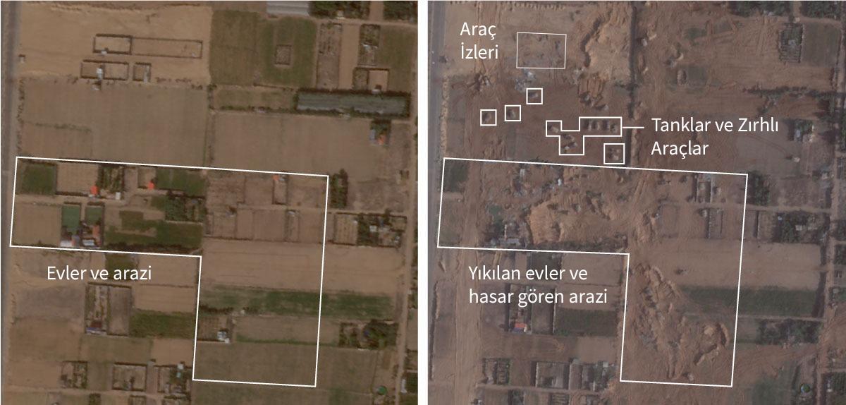 Her ne kadar hızlı bir giriş yapılmamış da olsa uydu şirketi Planet Labs’in pazartesi günü çektiği görüntüler ordunun işgal harekatını gözler önüne seriyor. Zira bu görüntülerde çok sayıda zırhlı aracın açık arazileri keserek kentsel alanlarda toplandığını gösteriyor. İsrail’e ait savaş araçlarının Gazze’nin kuzeyindeki El Karama mahallesinin güneyine kadar ilerlediği görülüyor.