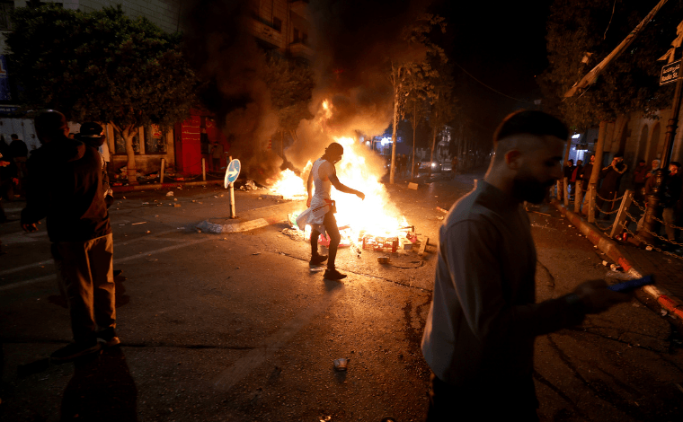 İşgal altındaki Batı Şeria’nın Ramallah kentindeki Filistin polisi, Gazze’deki hastane saldırısını protesto edenlere müdahale etti. Göstericiler, ateş yakarak bazı yolları kapattı. Fotoğraf: AA