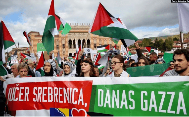 “Dün Srebrenitsa’ydı, bugün Gazze” yazılı pankart. Fotoğraf: Radio Free Europe