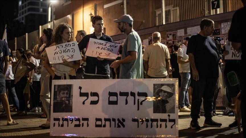 Gazze’deki İsrailli esirlerin aileleri, 14 Ekim gecesi ellerinde pankartlarla İsrail Savunma Bakanlığı binası önünde hükümeti protesto etti.