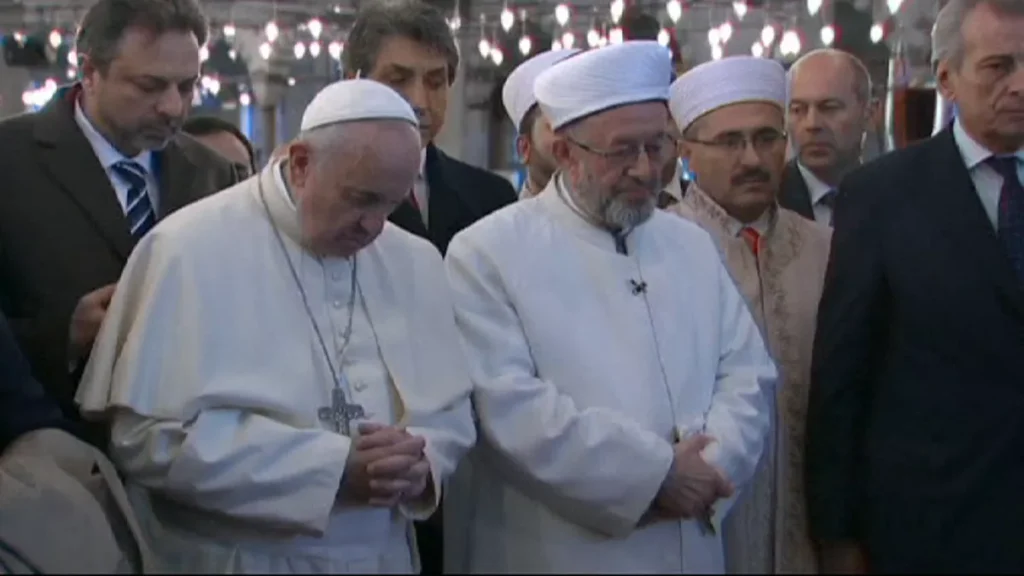 Katoliklerin Francis’den önceki ruhani lideri Papa Benedict de 2006 yılında Türkiye’yi ziyaret etmişti. Papa, ziyaretinin ikinci durağı Sultanahmet Cami’nde dünyaya damgasını vuran bir poz vermişti. Dönemin İstanbul müftüsü Mustafa Çağrıcı’nın daveti üzerine dostluk niyetiyle edilen sembolik dua sırasında yüzünü Kıble’ye dönüp kıyama durmuştu.