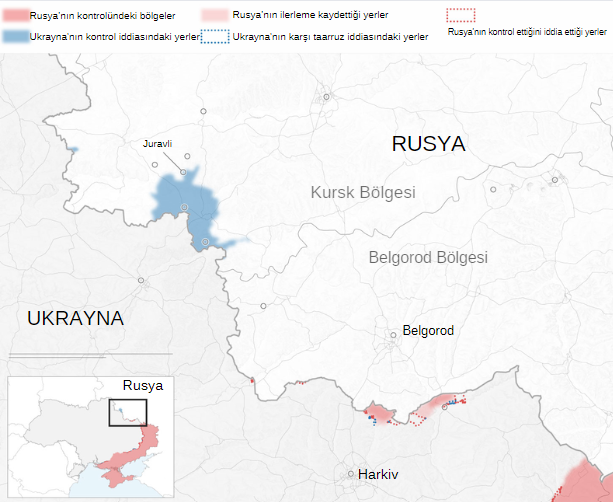 Kiev yönetimi pazartesi günü itibariyle Rusya topraklarının yaklaşık bin kilometrekarelik alanını kontrol altına aldığını iddia etti. ABD merkezli Savaş Araştırmaları Enstitüsü’ne (ISW) göre Rusya da bu yıl Ukrayna içindeki 1175 kilometrekareyi ele geçirdi. Yine de Rusya’nın 2014 yılından bu yana ele geçirdiği 100 bin kilometrekarelik alan hesaba katıldığında Ukrayna’nın ele geçirdiği alan çok küçük kalıyor.