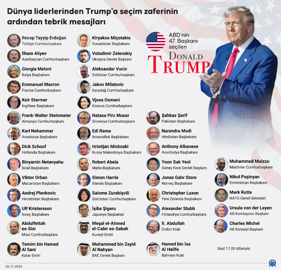 Cumhurbaşkanı Tayyip Erdoğan “Amerika Birleşik Devletleri’nde yapılan başkanlık seçimini büyük bir mücadelenin ardından kazanarak yeniden ABD Başkanı seçilen dostum Donald Trump’ı tebrik ediyorum. Amerikan halkının seçimiyle başlayacak olan bu yeni dönemde Türkiye-ABD ilişkilerinin güçlenmesini, Filistin meselesi ve Rusya-Ukrayna savaşı başta olmak üzere bölgesel ve küresel çapta yaşanan krizlerin, savaşların son bulmasını temenni ediyor; daha adil bir dünya için daha fazla çaba sarf edileceğine inanıyorum” dedi.