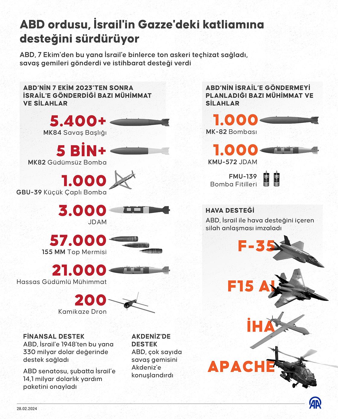 Zaten her yıl İsrail’e üç milyar dolarlık yardım yapan ABD savaş başladıktan sonra ek yardım paketleri duyurmaya başladı, normalde Amerikan Kongresi’nden onayından geçmesi gereken silah yardımlarını daha hızlı yapmak için kongre ekarte edildi ve Birleşmiş Milletler Genel Kurulu ve Güvenlik Konseyi’nde ezici bir çoğunluk ateşkes için bastırırken İsrail’in saldırılarına devam etmesi için bu çağrıları veto etti.