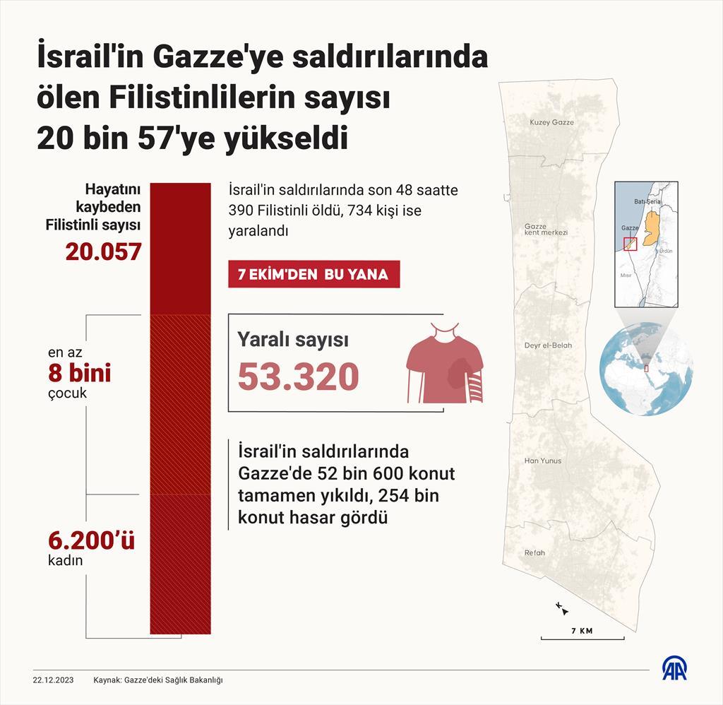 Sadece kimliği tespit edilebilenler ya da akrabaları tarafından alınan kişiler defnedilebiliyor ve Gazze Sağlık Bakanlığı’nın savaştaki ölü sayısına dahil ediliyor. Dolayısıyla ölü sayısının verilen rakamların çok daha üstünde olduğu ifade ediliyor. Çünkü öldürülen çok sayıda Filistinlinin naaşı da beden bütünlüğü bozulmuş ve kimlik tespiti yapılamayacak durumda. Gazze’de yeni bir ateşkes için uluslararası çağrıların yapıldığı Perşembe günü rakamlar 20 bin kişi civarındaydı. Bakanlık, enkaz altında da binlerce ölü olduğunu söylüyor. Ölenlerin yaklaşık yüzde 70’inin kadın ve çocuk olduğu belirtiliyor.